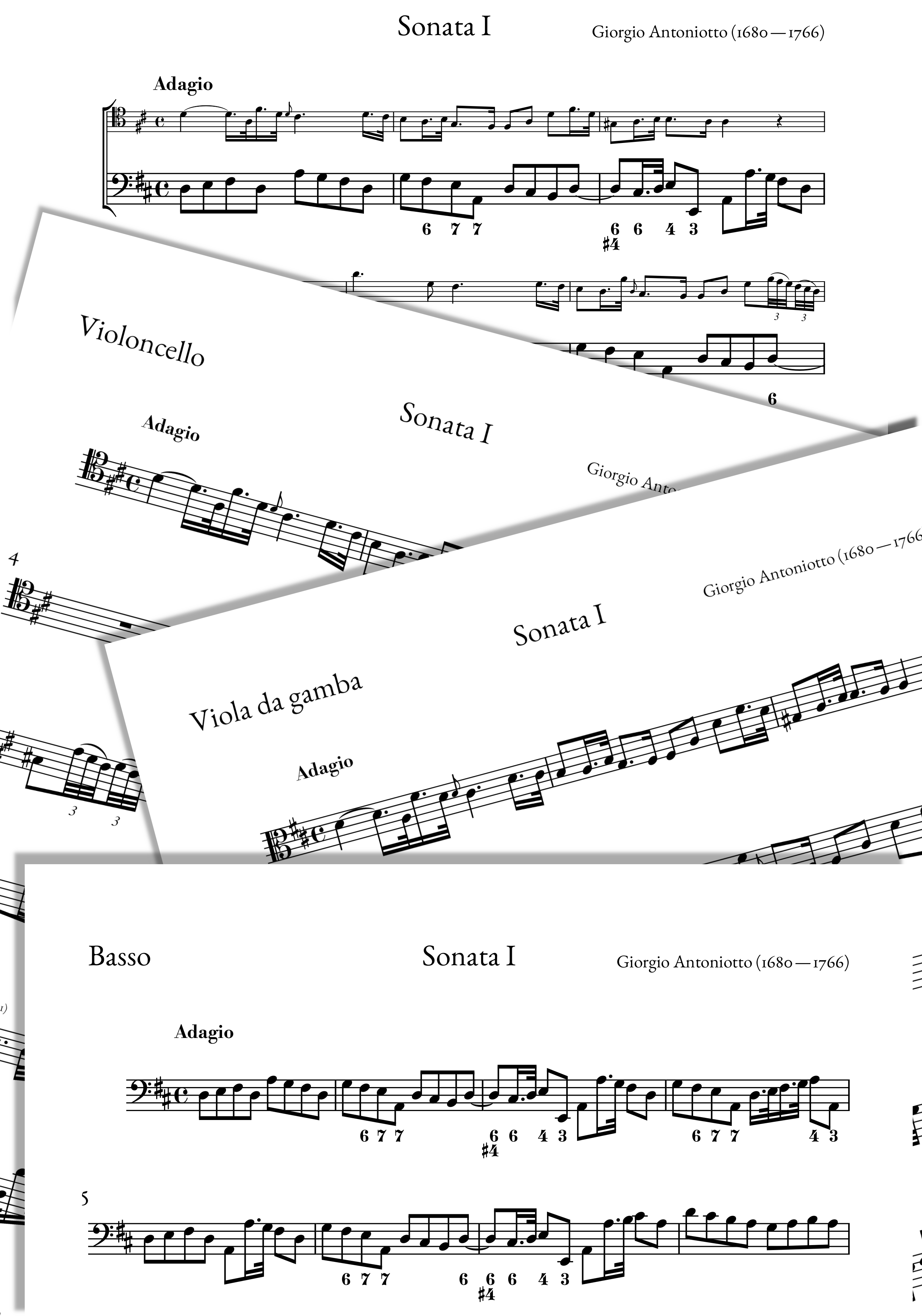 Contents: | Score and 3 separate parts (cello, viola da gamba, continuo) in A4 and A3 imposition |
